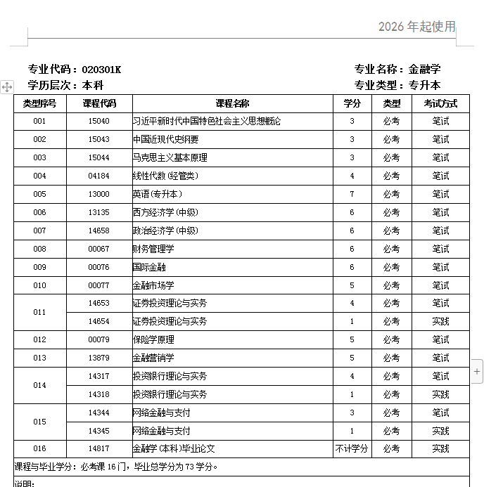 1. 2026年自考金融学课程安排: